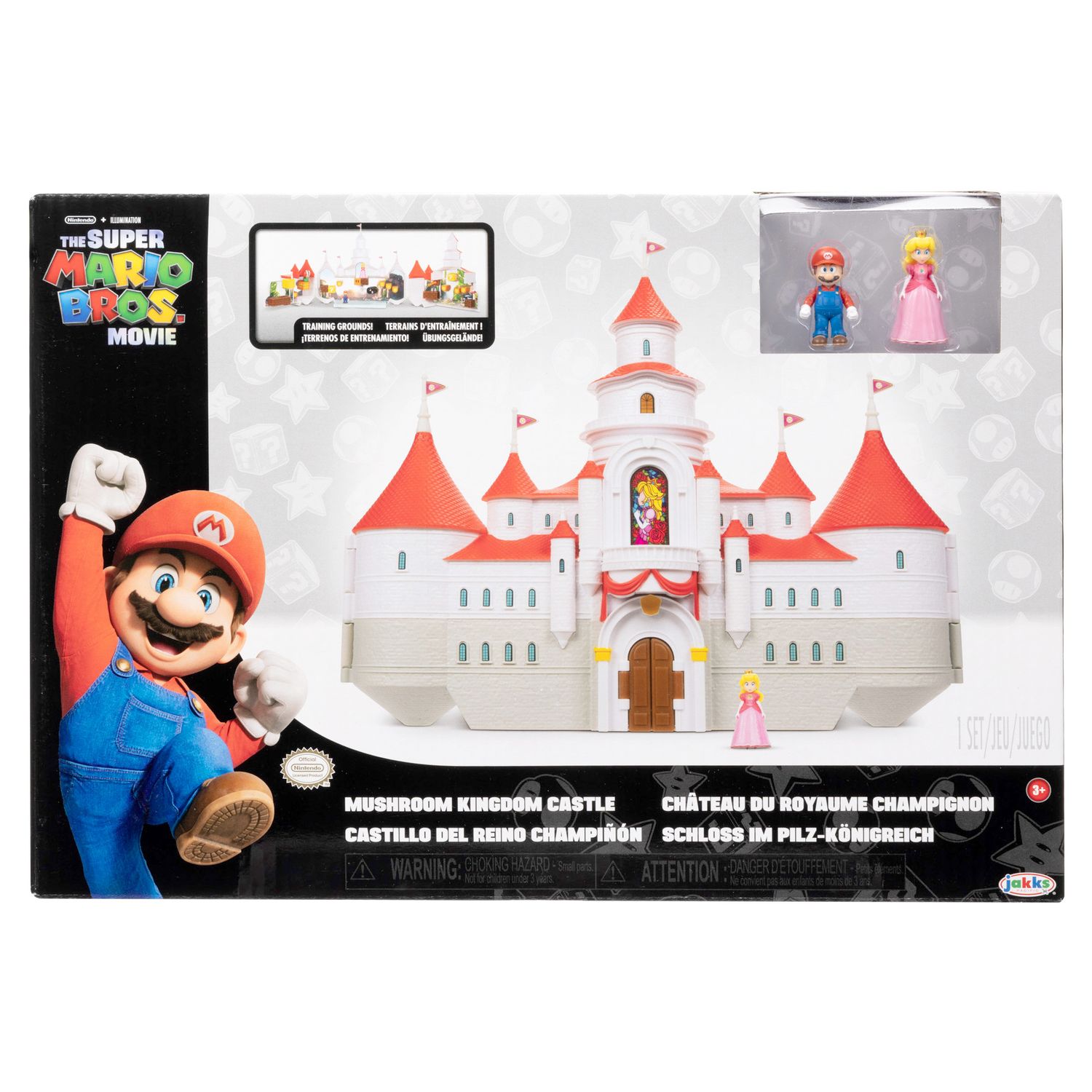 Plonge dans l'univers de Mario avec cette réplique du château de Princesse Peach. Ouvre le château et l’univers s’ouvre à tes figurines Mario et Princesse Peach pour atteindre le point d’interrogation et éviter les plantes piranha. Inclus un playset et 2 figurines d'environ 3 cm Mario et Princesse Peach.