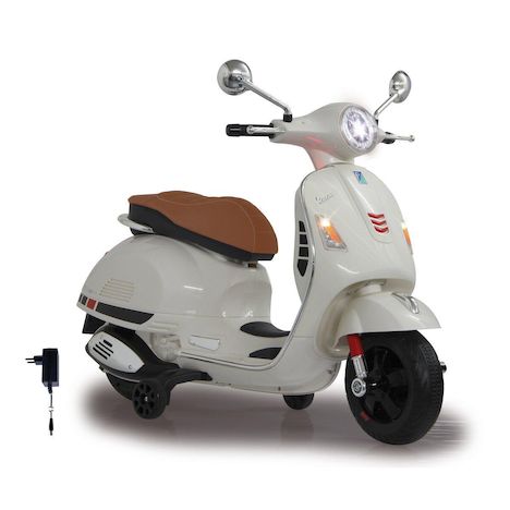 Contient : Porteur Vespa GTS 125 blanc L'ambiance italienne souffle ici indéniablement dans les chambres d'enfants! La Ride-on Vespa GTS 125 apporte la joie de vivre de la Dolce Vita directement à la maison. Ce petit scooter Vespa, que l'on rencontre dans toutes les villes italiennes, est désormais proposé par JAMARA sous forme de mini-moto sous licence. Les plus petits conducteurs, à partir de 3 ans, peuvent déjà passer de la chambre d'enfant au salon avec ce scooter. Avec son design sous licence officielle et ses détails réalistes comme le tableau de bord éclairé et le son du moteur au démarrage, chaque enfant aura l'impression de rouler sur un vrai scooter. Les puissants moteurs d'entraînement et la batterie lithium-ion de 12,6V garantissent de longues heures de conduite et beaucoup de plaisir. Le siège rembourré en similicuir assure un confort maximal, tandis que les roues stabilisatrices permettent de rouler en toute sécurité. Le port USB, la connexion audio auxiliaire et le slot Micro SD avec fonction MP3 apportent en plus le plaisir de la musique sur la route. Le design fidèle à l'original, les roues stabilisatrices et les anneaux en caoutchouc Ultra Grip sur les roues font de la Vespa un véritable accroche-regard, tandis que le démarrage sans clé par simple pression sur un bouton assure un confort facile. Un véhicule parfait pour les petits fans de Vespa - et pendant que les enfants s'amusent, les parents peuvent peut-être s'accorder une petite pause autour d'un espresso!
