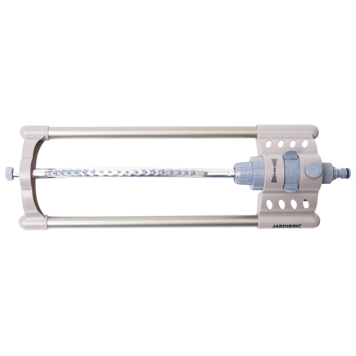 Informations produit:Arroseur oscillantMatériau: métalType: MinuterieSurface arrosée à 2 bars: 15,4m x 13,6mConsommation 500L/hCouleurs: Gris / TaupeMarque: Jardibric