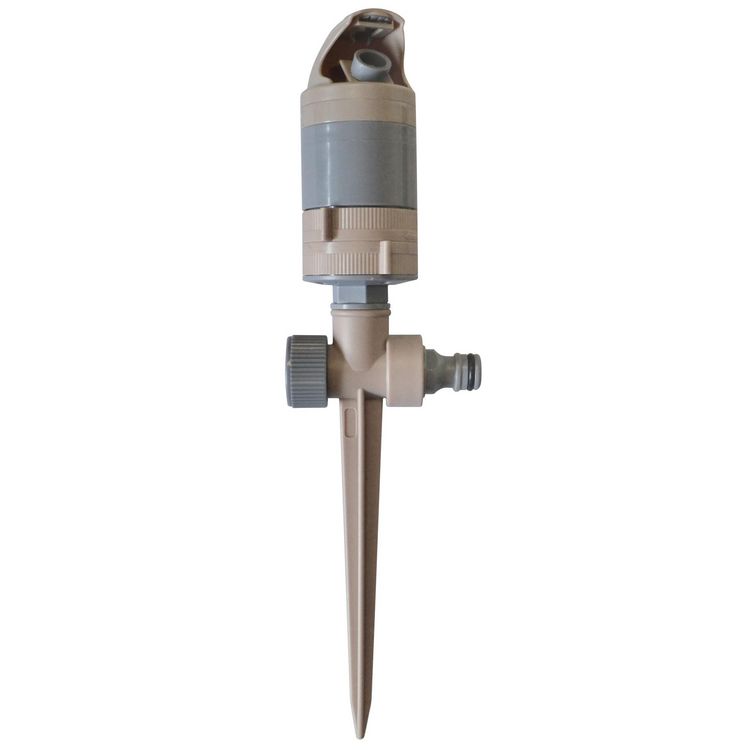 Description détaillée du produit: - produit: arroseur turbine rotatif - marque: Jardibric - nombre de jets: 2 - caractéristique: sur pic passant - matière: plastique - coloris: taupe et gris