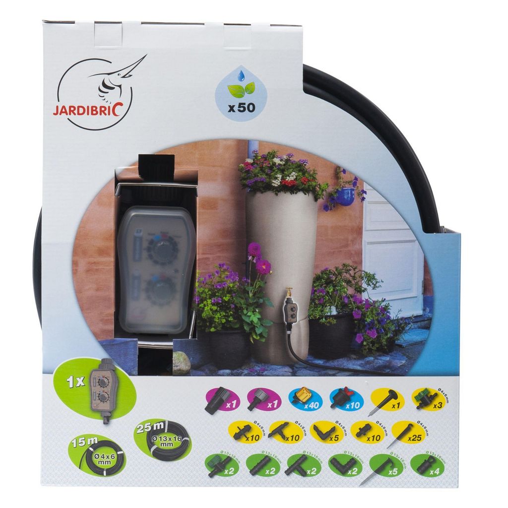 Informations produit:Kit d'arrosage jardin et terrasseRésistant aux UVMatière du tuyau: PolyéthylèneDiamètre de raccordement: 16 mmNombre de voies: 1Longueur du tuyau: 25mPression maximum: 8 barsPrise pour pluviomètre: OuiSans phtalateTémoin de niveau d'usure des piles: OuiMarque: Jardibric
