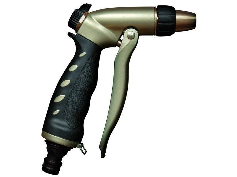 Jet réglable: Oui Nombre de jets possibles: 2 Débit réglable: Oui Matière principale: Métal Type de jet possible: 1 jet crayon à jet brouillard Diamètre du tuyau destiné (en mm): 12.5, 15 ou 19 Blocage de gâchette pour pistolet: Oui Nom du produit: Pistolet Télescopique: Non Produit emballé : haut