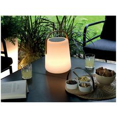 Enceinte musicale d'extérieure lumineuse LED portative. Compacte et légère, à emporter partout avec vous.Materiau PE6 LED blanc chaudAnse motif boisChargement de 4 heures et autonomie de 8 heuresCable de démarage USB 1,5 mConnectivité : Bluetooth ou câble USB 1,5 mDimensions (Ø x H) : 21 x 32 cmCara