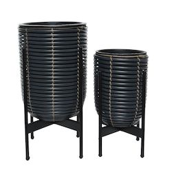 Des cache-pots sur pieds avec une doublure intérieure et un bouchon de vidange pour évacuer l'eau d'arrosage ou de la pluie.