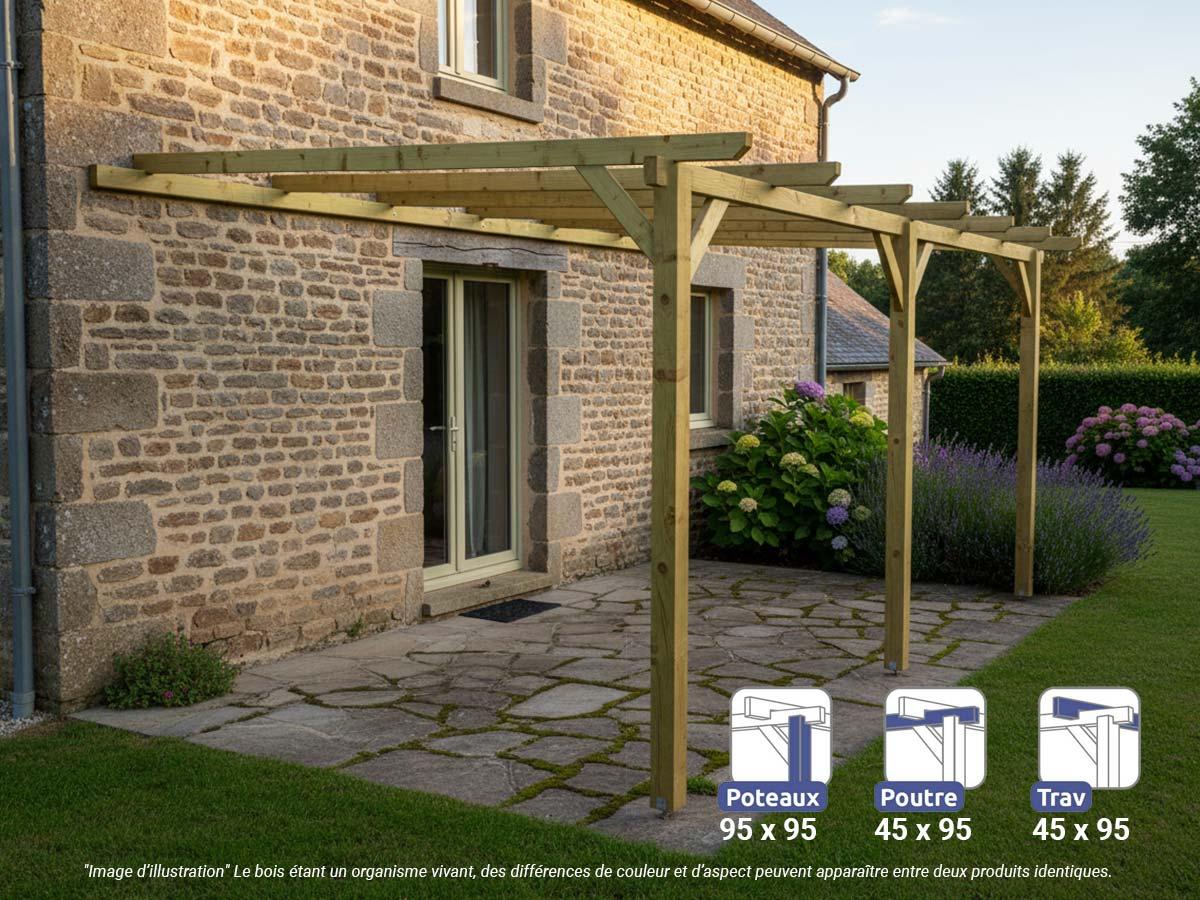 La pergola bois adossée Orléans est fabriquée par Maderland en pin massif traité du nord de l'Europe. Sa croissance lente assure une résistance élevée à la flexion, à la compression et à la traction.