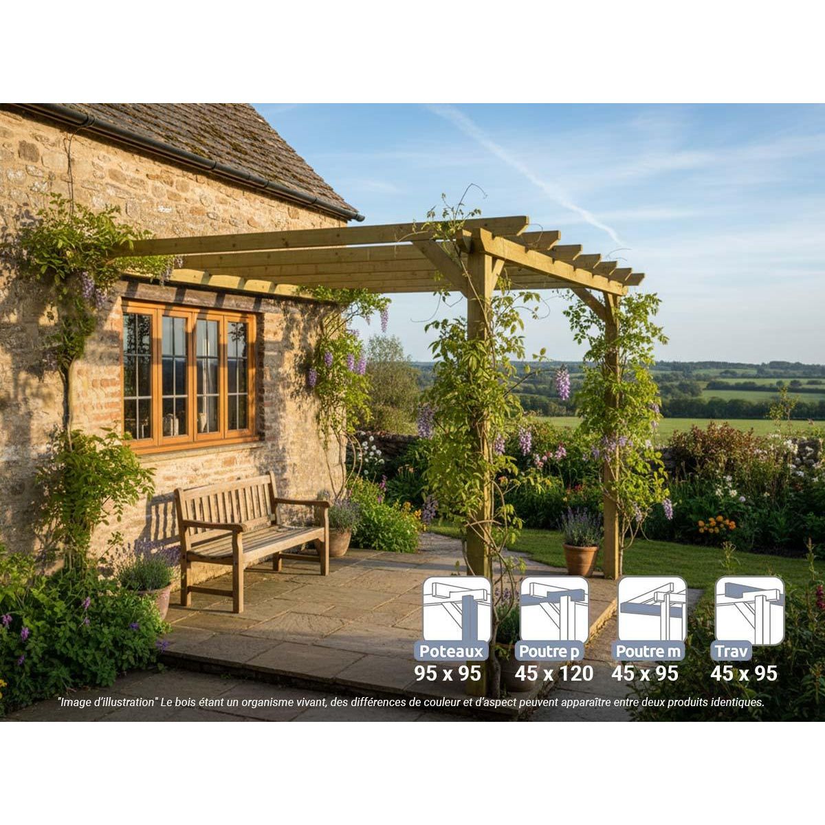 La pergola bois adossée Saint-Denis de Maderland est réalisée en pin massif traité du nord de l'Europe. Sa croissance lente lui confère une très bonne résistance à la flexion, la compression et la traction.