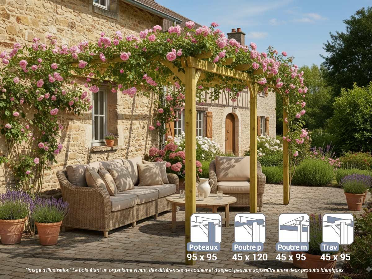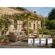 La pergola bois adossée Saint-Denis de Maderland est réalisée en pin massif traité du nord de l'Europe. Sa croissance lente lui confère une très bonne résistance à la flexion, la compression et la traction.
