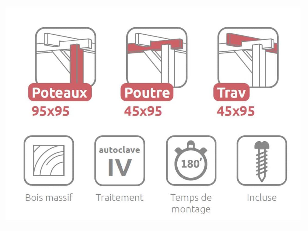 Fabriquée en bois massif traité provenant du nord de l'Europe, cette pergola bénéficie d'une croissance lente garantissant une résistance accrue à la flexion, à la compression et à la traction.
