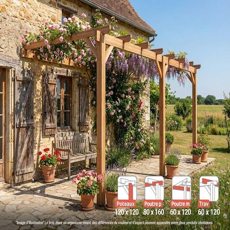 Toiture personnalisable : Toit ouvert permettant l'ajout d'une couverture (toile, canisse, auvent coulissant...). Fixation au sol indispensable à l'aide de supports métalliques (non inclus mais proposés en option).