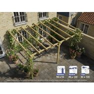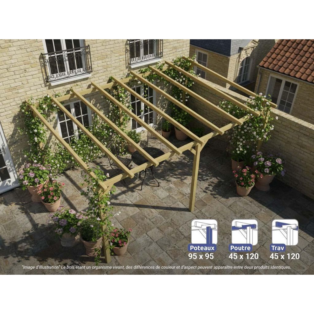Le toit peut être couvert par une bâche, un auvent, du canisse, etc. Pour plus de stabilité, fixez correctement la pergola au sol à l'aide de supports métalliques (optionnels) et de vis adaptées.