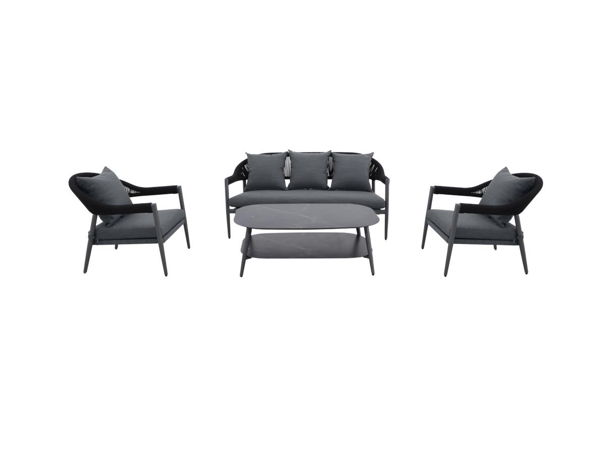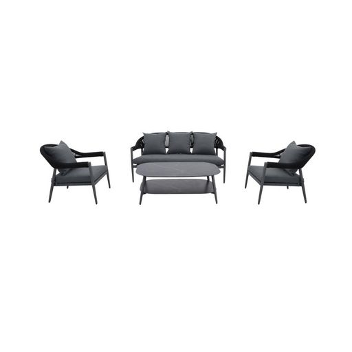 Ce set de 4 pièces comprend un canapé 3 places, deux fauteuils et une table, conçus avec une structure en aluminium légère et résistante, une finition Rope élégante ainsi qu'un plateau en Fairstone.