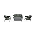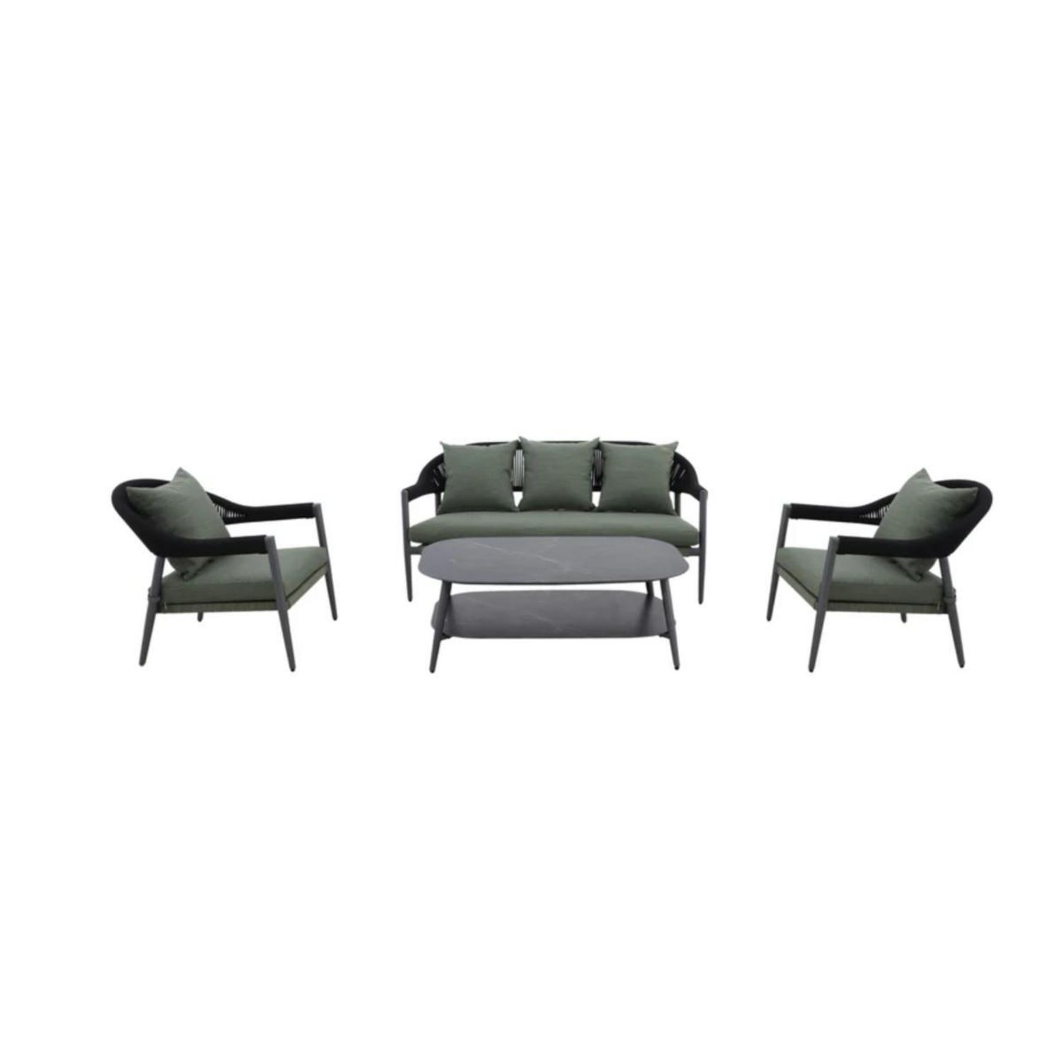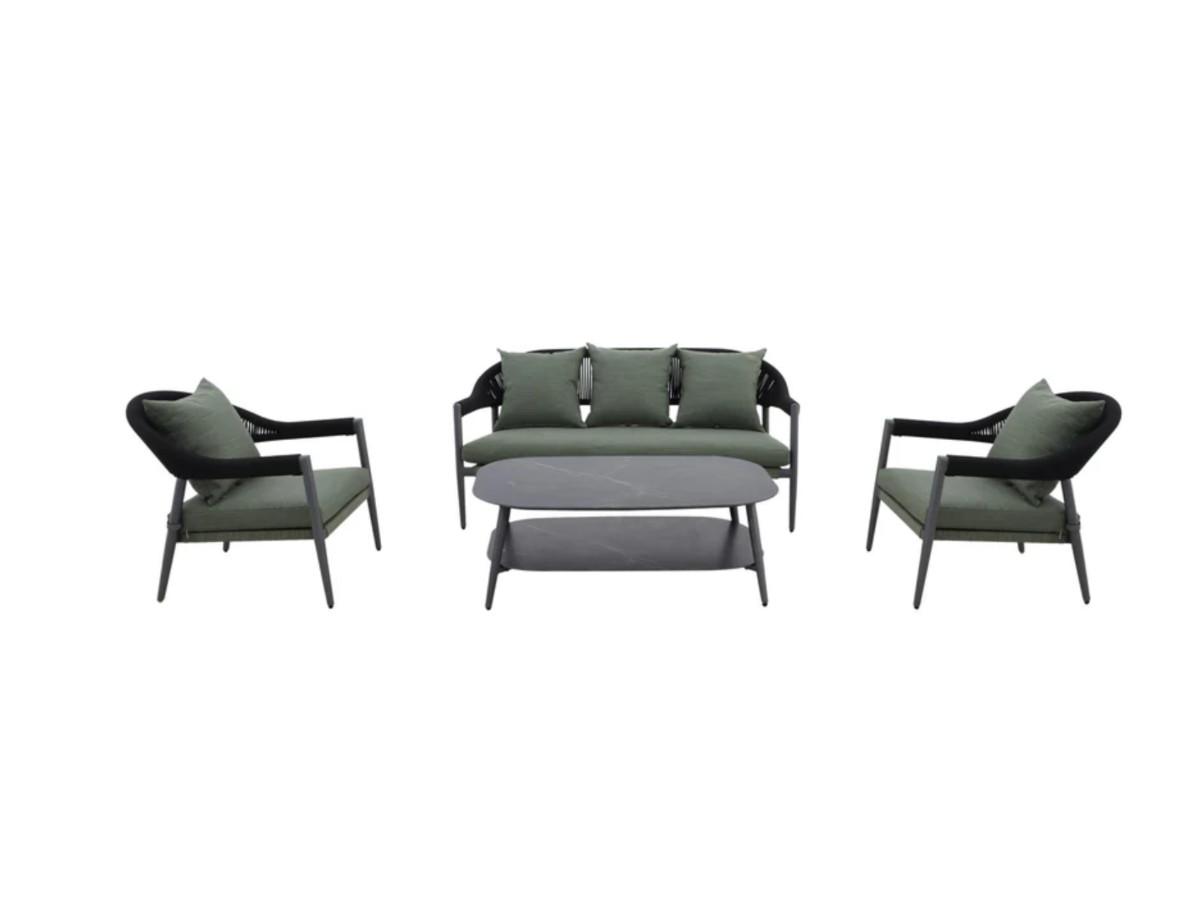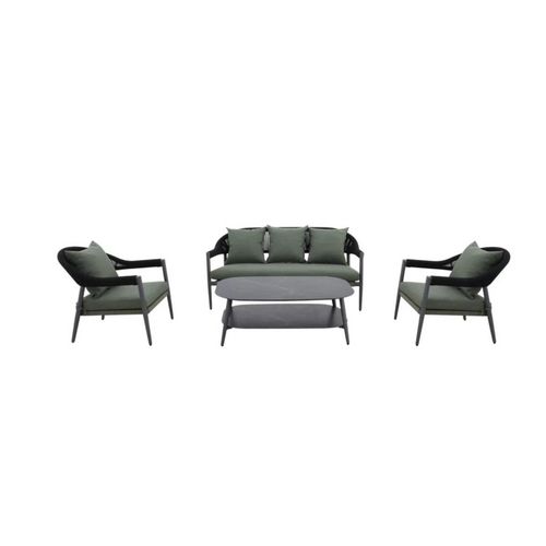 Ce set de 4 pièces comprend un canapé 3 places, deux fauteuils et une table, conçus avec une structure en aluminium légère et résistante, une finition Rope élégante ainsi qu'un plateau en Fairstone.