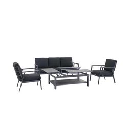 Avec le salon de jardin CATALINA, offrez à votre extérieur une ambiance contemporaine et chaleureuse. Composé d'un canapé 3 places, de deux fauteuils et d'une table basse ingénieuse, cet ensemble bas séduit par sa structure en aluminium gris mat rehaussée de renforts en acier et d'élégants accoudoirs effet orme, obtenus par transfert thermique.