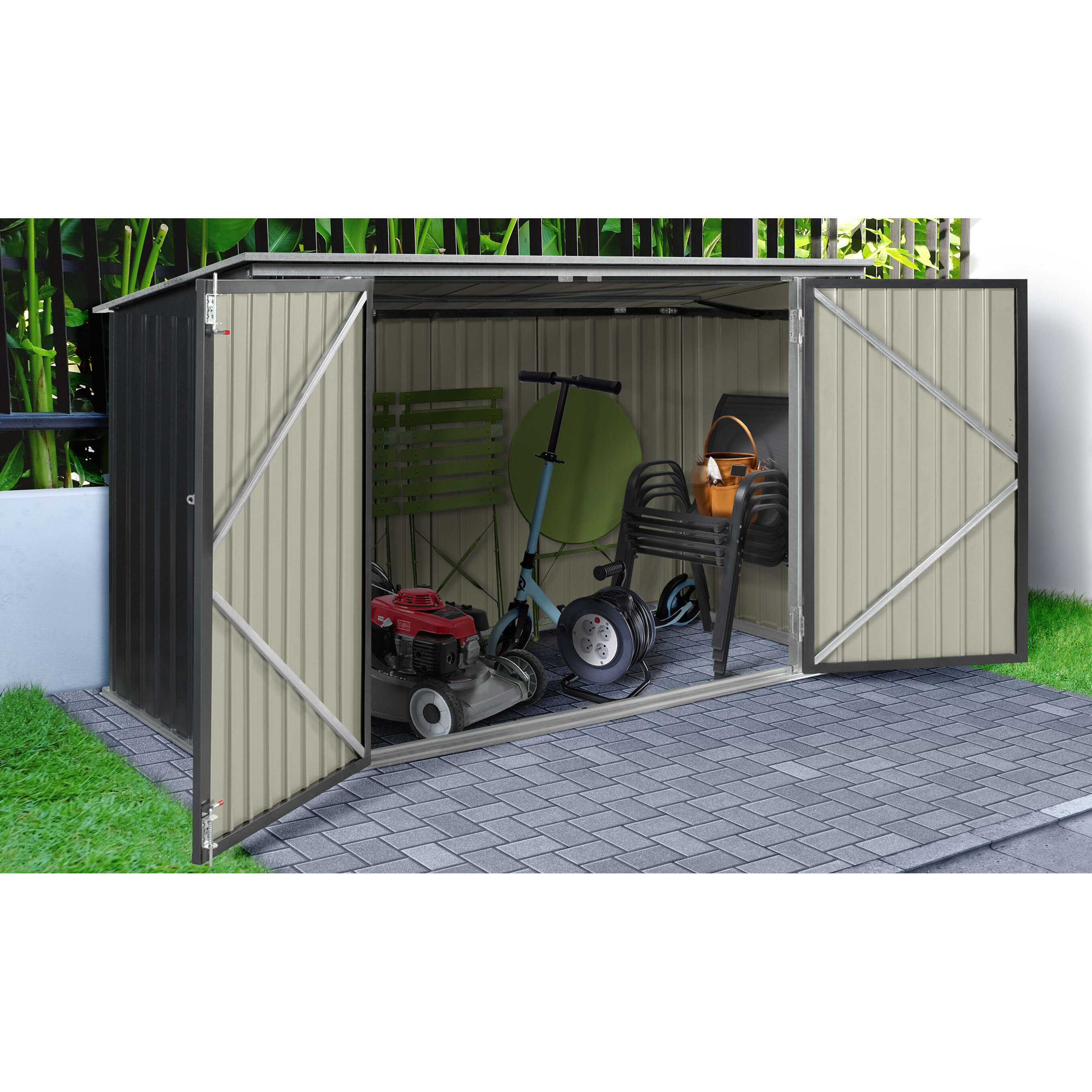 Dimensions par défaut : (L) 210 x (l) 105 x (H) 130 cm Dimensions intérieures : (L) 197 x (l) 92.7 x (H) 125.5 / 111.7 cm Matériaux : Acier galvanisé Coloris : Gris anthracite Hauteur face avant : 130 cm Hauteur face arrière : 115 cm Porte : (L) 150 x (H) 121 cm Ouverture du couvercle: 64 cm