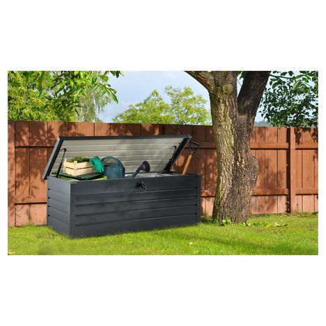 Ce coffre de jardin est idéal pour stocker des coussins, outils de jardin, jouets ou divers accessoires et objets plus volumineux Conçu en acier galvanisé, il garantit une grande durabilité et une excellente résistance aux intempéries. Ses 2 vérins à gaz permettent une ouverture / fermeture facile du couvercle.