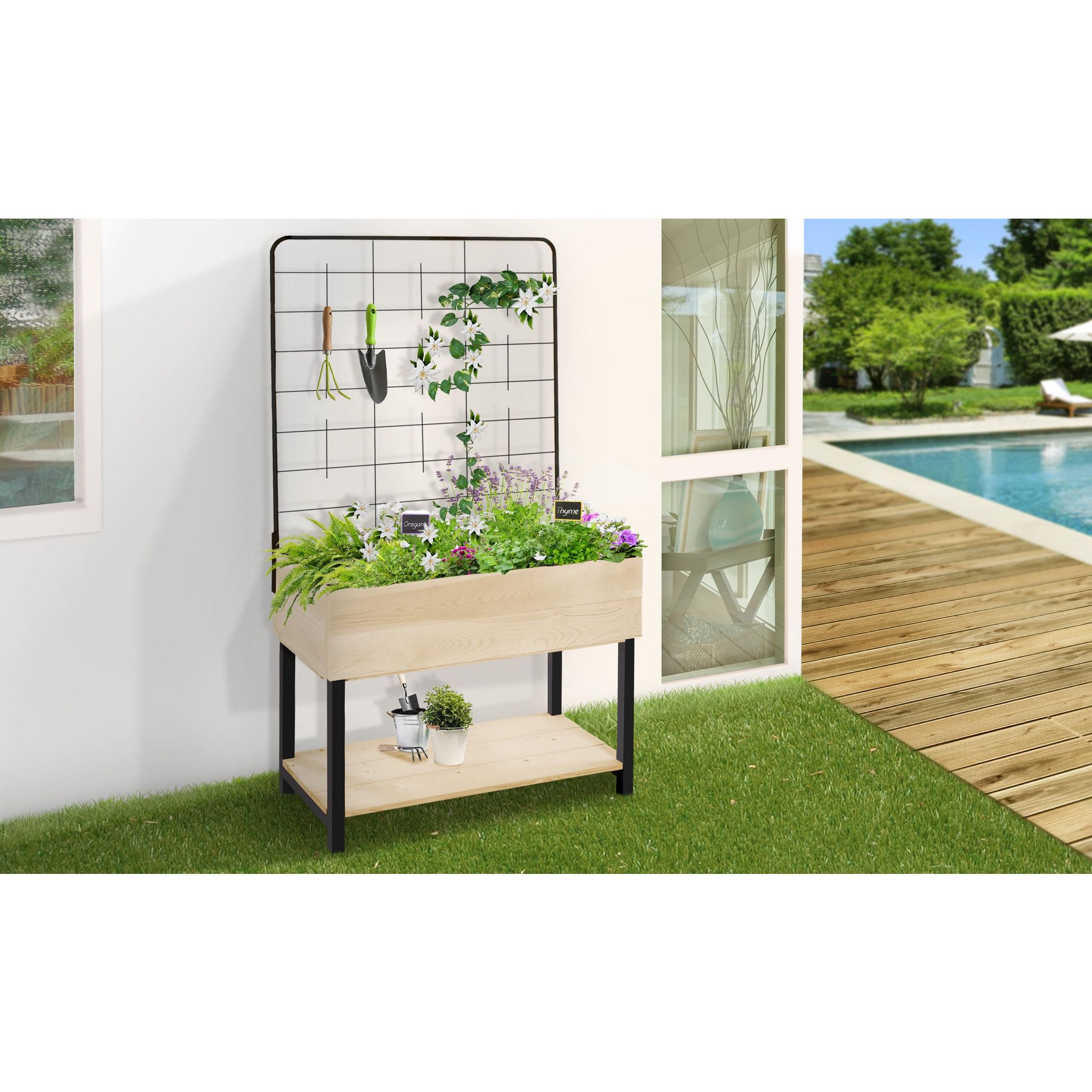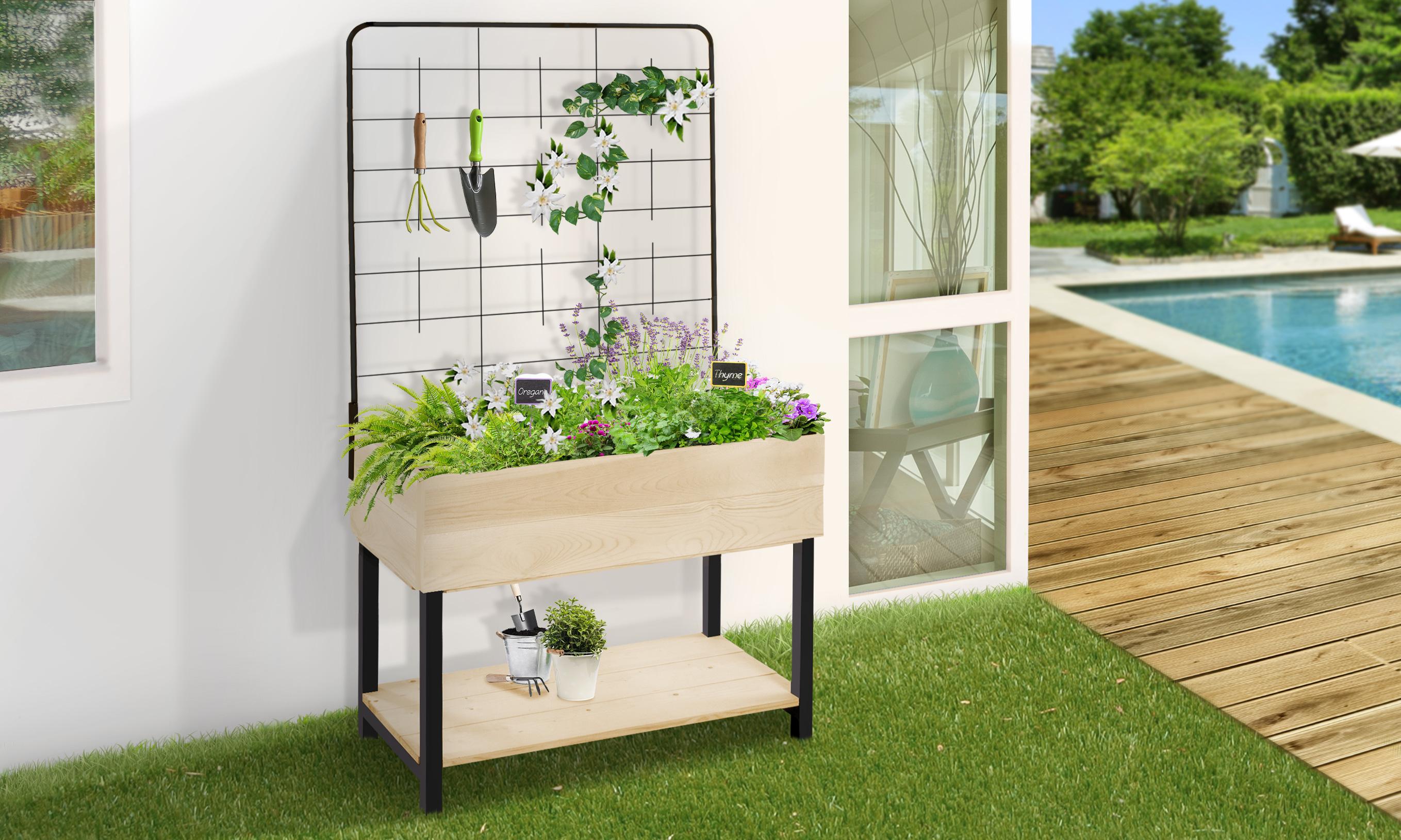 "Cette jardinière surélevée est idéale pour réaliser des compositions florales ou pour cultiver des fruits, légumes ou plantes aromatiques. Son treillis amovible est très utile pour la culture des plantes grimpantes. Grâce à son étagère, vous pourrez y entreposer terreau et outils de jardinage. E