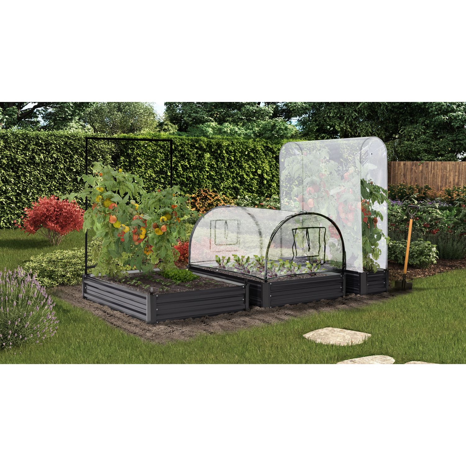 Composition : 1) x1 Serre de potager 12 compartiments 2) x1 Serre de potager tomates 3) x1 Grand carré potager 12 compartiments avec treillis métallique 1) Serre de potager Metal Dimensions globales: (L) 115 x (l) 80 x (H) 60 cm (avec bâche) Hauteur (sans bâche) : 20 cm Matériaux : Acier / Bâche en Polychlorure de Vinyle (PVC) Coloris : gris anthracite À monter soi-même : Oui Angles renforcés en métal Diamètre tube : 16 mm PVC bâche : 0,1 mm Ouverture de la bâche : (L) 23 x (H) 24 cm 2) Serre de potager tomates Metal Dimensions serre montée : (L) 115 x (l) 30 x (H) 128 cm Dimensions bâche : (L) 235 x (l) 125 cm Dimensions structure en métal : (L) 115 (l) 30 x (H) 20 cm Épaisseur bâche : 0.6 mm Diamètre tubes : 11 mm Matériaux : Acier, Polyéthylène (PE) Tuteurs inclus 3) Carré potager métal avec treillis métallique Dimensions structure en métal : (L) 115 x (l) 80 x (H) 20 cm Dimensions avec treillis : (L) 115 x (l) 80 x (H) 125 cm Dimensions du treillis : (L) 100 x (l) 76 cm Matériaux : Acier Coloris : gris anthracite Épaisseur du bois : 14 mm Diamètre tubes : 16 mm Angles renforcés en métal