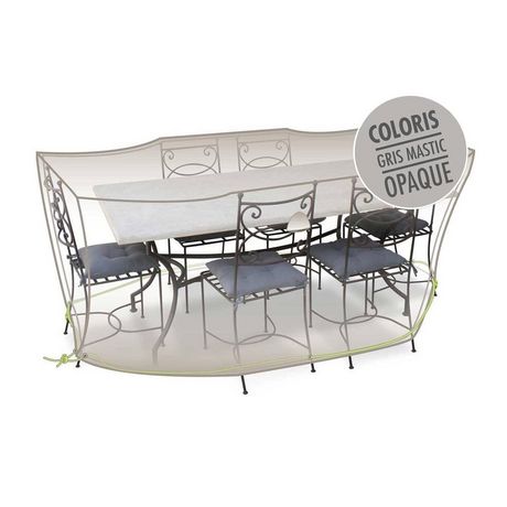 Jardiline CLS02 HOUSSE Housse de protection table rectangulaire et chaises 6 à 8 personnes. Protection contre la pluie, la pollution, et les rayonnements du soleil. - Housse de protection imperméable.Coutures étanches. Fourni avec Sangle + cordon + oeillets.Couleur : Gris mastic opaque.Dimensions :