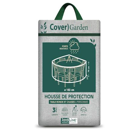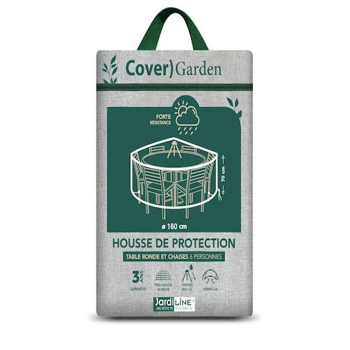 Housse de protection Cover Garden CGS04 pour table ronde 6 personnesProtégez votre mobilier extérieur des intempéries avec cette housse Cover Garden CGS04, adaptée à une table ronde Ø160 x 70 cm et ses chaises. Son tissu polyester haute densité 160?g/m² avec enduction PU et coutures doubles assure r