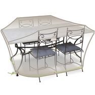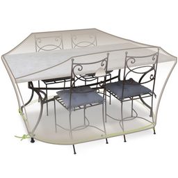 Jardiline CLS01 La housse de table rectangulaire et chaises 4 à 6 personnes Jardiline CLS01 est spécialement conçue pour protéger une table 4/6 personnes et 4 chaises contre la pluie, la pollution, et les rayonnements du soleil. 100% Imperméable, coutures étanches, sangle + cordon + oeillets. Aérateurs. Cette housse de protection combine robustesse, praticité et esthétisme. Grâce à la toile polyester haute densité, elle résiste très bien aux UVs et à la pluie.