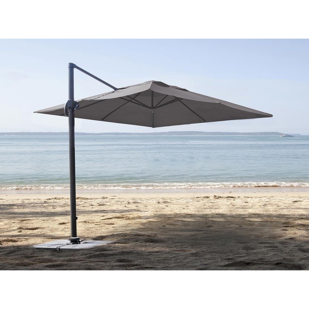 En savoir +Parasol excentré carré TRINIDAD avec structure en aluminium dimensions L 300 x l 300 x H 266 cm. 8 baleines. Multipositions. Rotation 360°. Pieds en croix. Toile polyester 250 g/m² coloris taupe. Vendu sans dalles de lestage.