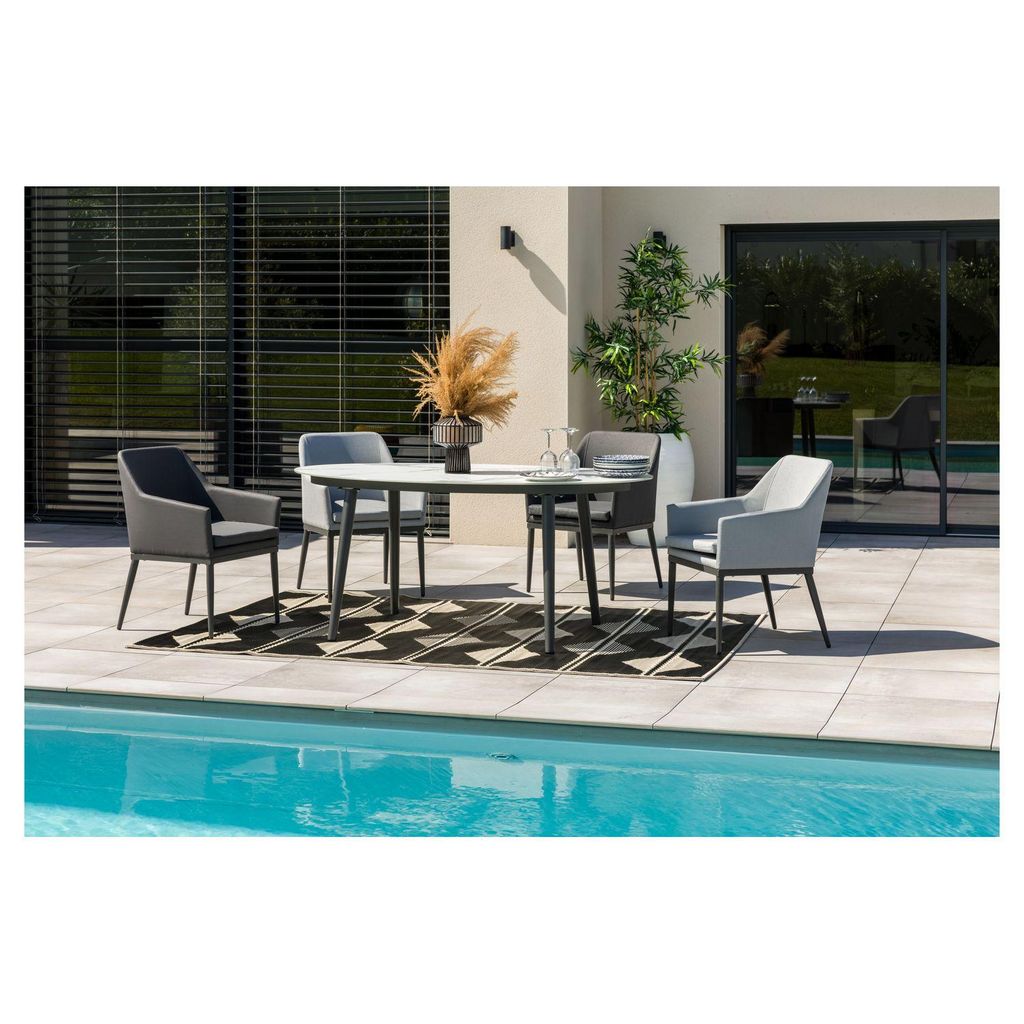 Optez pour un style original avec ce salon repas de jardin 4 places FORMENTERA proposé par la marque JARDILINE . Ce salon jardin est composé d'une table très chic de par sa forme ovale et sublimé par son plateau en verre céramique aspect marbre qui peut accueillir jusqu'à 6 personnes. Cette table est associée avec 4 fauteuils de jardin déclinés en 2 coloris, gris clair et gris anthracite qui se veut contemporain tout en étant pratique et confortable. Faites de cet ensemble la pièce maîtresse de votre déco d'extérieur.