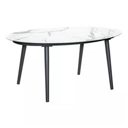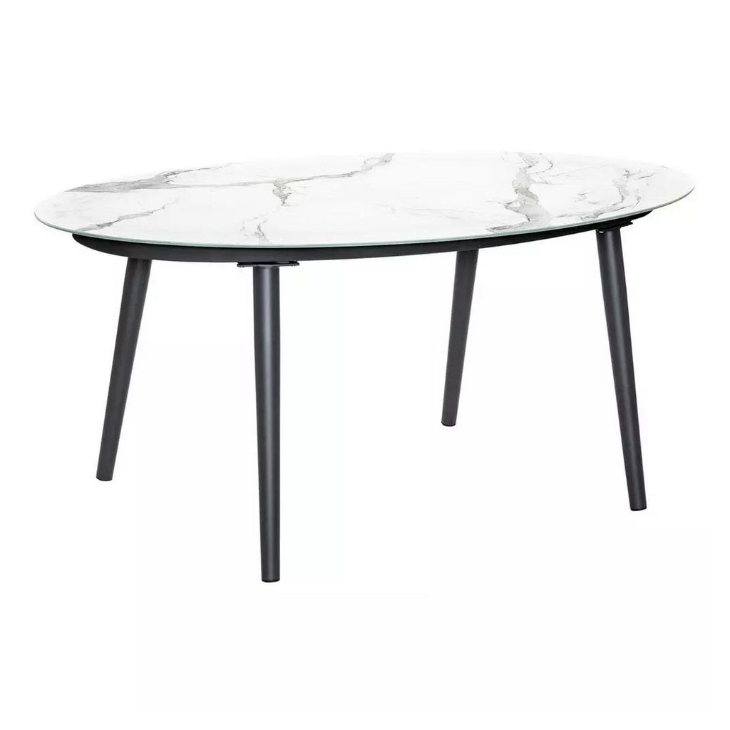 Table ovale 6 personnes. Structure en aluminium anthracite avec plateau en verre céramique aspect marbre clair.