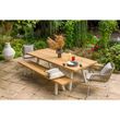 "Table rectangulaire 10 personnes avec structure et pieds en aluminium coloris blanc. Plateau (épaisseur 5 cm) en teck recyclé coloris naturel.