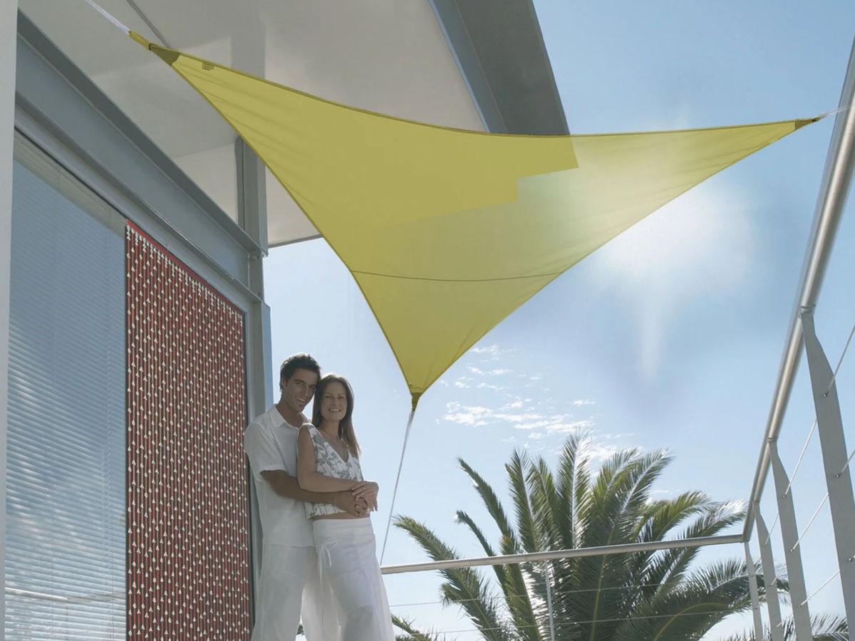 Grand voile d'ombrage triangle Serenity 5 x 5 x 5 m pour terrasse en polyester de qualité. Avec ceinture de renfort et anneaux inox. Barrière aux UV et étanche. Plusieurs couleurs possibles.