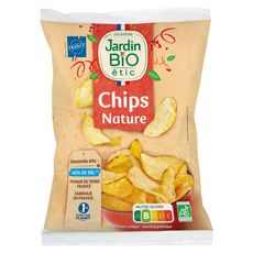 Craquez pour les Chips Nature Jardin BiO étic®, à partager à l'apéritif entre amis ou autour d'un pique-nique en famille ! Un produit de qualité, fabriqué avec des ingrédients français, sans huile de palme, sans arômes ajoutés et bien sûr avec 40%** de sel en moins. **par rapport à la moyenne des chips de pommes de terre du marché OFG -40% de sel Pomme de terre France Fabriqué en France Sans huile de palme 1% For The Planet BIO -40% de sel Source de fibres Sans arômes ajoutés