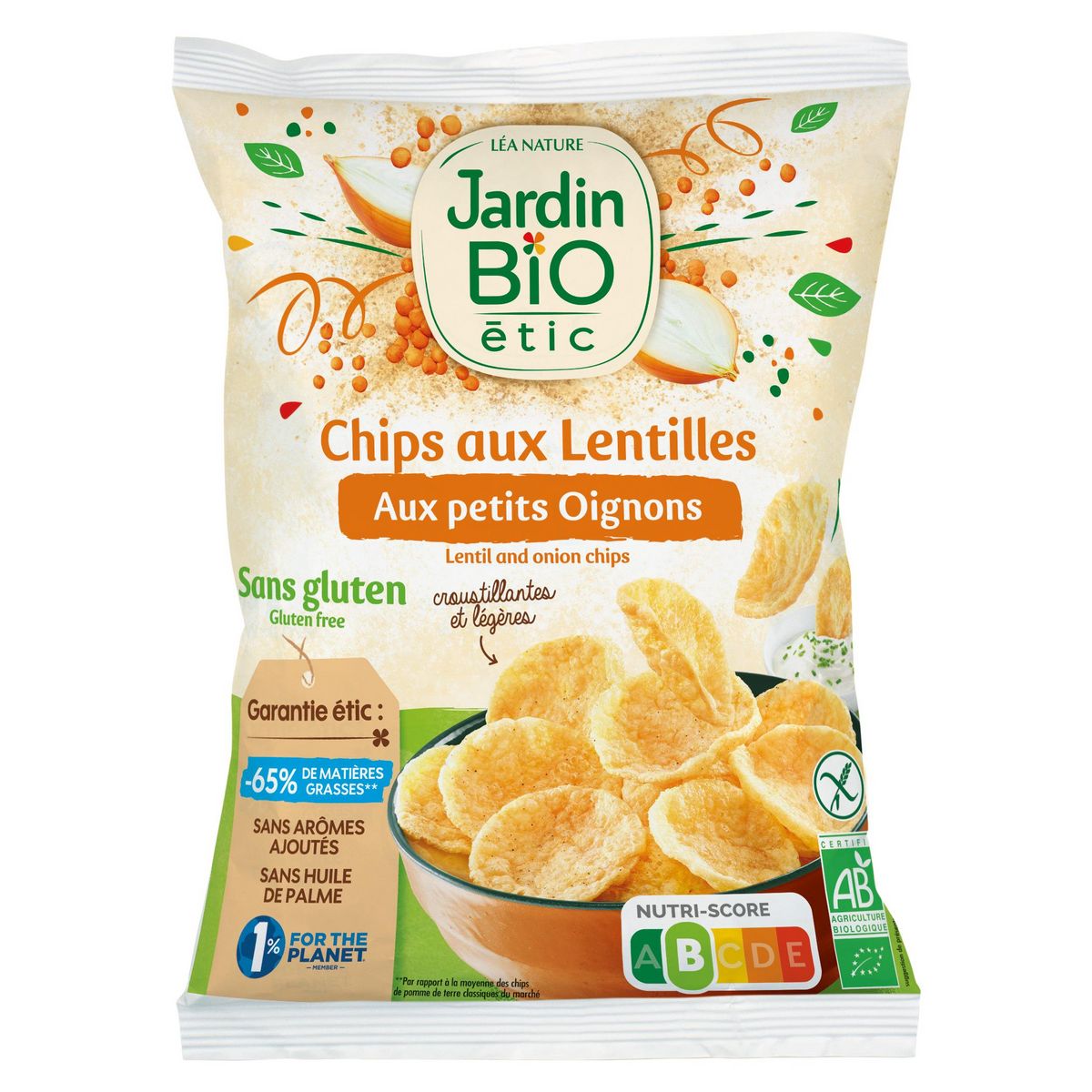 Découvrez un délice de chips sans gluten ! Jardin BiO étic® vous propose un encas sain et savoureux avec 65% de matières grasses en moins que des chips de pomme de terre classiques**. Cette recette originale aux lentilles associées au délicat goût de l'oignon accompagnera vos apéritifs ou vos petites pauses gourmandes de la journée. Sans huile de palme 1% for the planet BIO Sans gluten -65% de matières grasses Source de fibres Sans arômes ajoutés