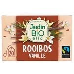 Découvrez le rooibos bio Jardin BiO étic® cultivé en Afrique du Sud et soigneusement sélectionné. Une gamme plaisir, éthique et responsable ! Offrez-vous un moment de douceur grâce à l'harmonie du rooibos et de la vanille. Sans théine, le rooibos peut être dégusté à tout moment de la journée. Le Rooibos et la vanille sont issus du commerce équitable : cultivé par des producteurs certifiés et commercialisés selon les standards du label Fairtrade/Max Havelaar. 100% du poids total. www.maxhavelaarfrance.org Infusion Rooibos à l'arôme naturel de vanille bio Equitable certifié Max Havelaar (selon disponibilité) Fabriqué en France Infusettes et film compostables Etui carton 80% fibres recyclées 1% pour la planète Bio 20 sachets