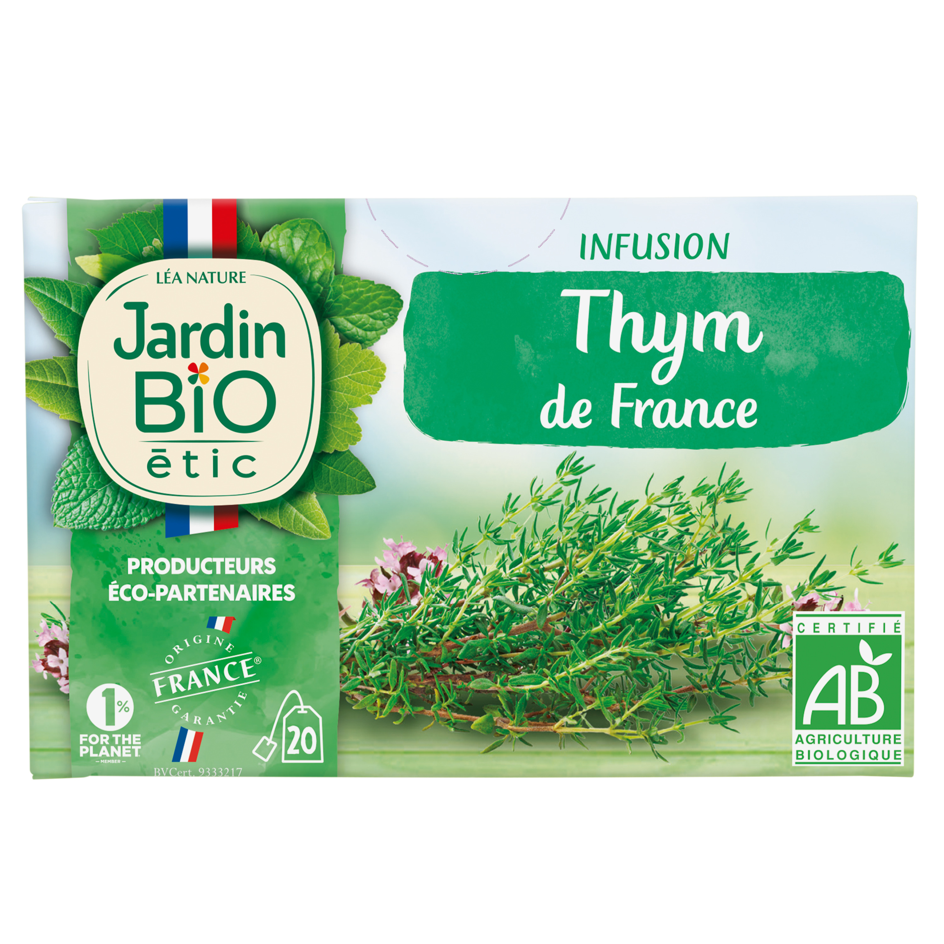 RETROUVEZ LES INFUSIONS NATURELLES, ÉTHIQUES ET RESPONSABLES 100% PLANTES JARDIN BIO ÉTIC® SÉLECTIONNÉES AVEC SOIN POUR VOUS OFFRIR LE MEILLEUR DES PLANTES DU JARDIN À LA TASSE ! Le thym, au goût si caractéristique, est la plante star de l'hiver à consommer en infusion. Le thym contribue à apaiser les voies respiratoires et les gorges sensibles Infusion 100% Thym bio Origine France Garantie Infusettes compostables Etui carton 80% fibres recyclées 1% for the planet 100% Bio 20 sachets