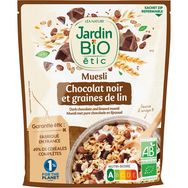 Pour bien démarrer la journée, Jardin BiO étic® a sélectionné pour vous ce délicieux muesli gourmand au chocolat noir pur beurre de cacao, élaboré sans huile de palme. Grâce à la présence de graines de lin, source d'acide gras alpha-linolénique, un acide gras oméga-3, ce muesli permet d'allier à la fois plaisir et nutrition. Il est source d'acide gras alpha-linolénique, un acide gras oméga-3 dont la consommation contribue au maintien d'une cholestérolémie normale. Pour bénéficier pleinement des bienfaits de ce dernier, il est recommandé d'en consommer 2 grammes par jour en associant par exemple dans votre journée diverses sources naturelles d'acide gras oméga-3 (poissons gras comme le saumon, graines de lin, huile de colza...).