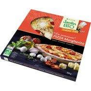 Pizza bio à base de sauce tomate, emmental et mozzarella.