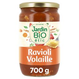 Jardin Bio étic© a concocté une délicieuse recette de raviolis à la volaille cuisinés à la tomate et aux petits légumes Bio. A déguster seul en plat, ou en gratin pour plus de gourmandise ! Cuisiné en France Volaille élevée en plein air 1% for the planet Bio sans arômes ajoutés