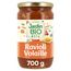 Ingrédients : eau, tomates* 27% [purée de tomates* mi-réduite, purée de tomates* double concentrée, pulpe de tomates* au jus, correcteur d'acidité : acide citrique], ravioli* 16% [pâte* (semoule de BLE* dur, eau), viande de dinde* 4,1%, chapelure* (farine de BLE*, sel), purée d'oignons* (oignons*, eau, huile de tournesol*, jus de citron*), huile de tournesol*, sel, persil*, ail*, muscade*, poivre*], oignons* en morceaux, carottes* en morceaux, huile de tournesol*, sucre de canne*, sel marin, plantes aromatiques*, purée d'ail*, poivre gris*. *Produits issus de l'agriculture biologique. Peut contenir des traces de SOJA, OEUFS et LAIT.