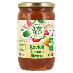 Jardin Bio étic vous propose cette délicieuse recette italienne de ravioli à la ricotta, un fromage qui se marie à merveille avec l'épinard. Un plat cuisiné bio, rapide à réchauffer. Bon appétit ! Cuisiné en France 1% for the Planet BIO Sans arômes ajoutés
