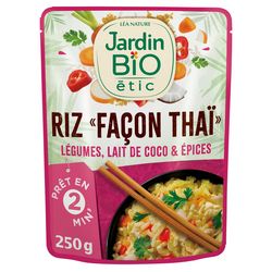 Partez à la découverte des saveurs du monde grâce à cette délicieuse recette inspirée de la cuisine thaï composée d'un riz onctueux cuisiné aux petits légumes et lait de coco, relevé par un savoureux mélanges d'épices. Un repas pratique et gourmand qui vous fera voyager en 2 min au micro-ondes. Bon appétit ! Riz cuisiné aux petits légumes, lait de coco et épices Cuisiné dans notre conserverie Bio en France 1% pour la planète BIO Sans arômes ajoutés Prêt en 2 minutes