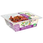 INGRÉDIENTS Carottes* 26%, petits pois* 23%, choux* rouge 22 %, vinaigrette* (huile de tournesol*, eau, vinaigre d'alcool*, moutarde* (vinaigre d’alcool*, graines de moutarde*, eau, sel), sel, épaississants : gomme xanthane – gomme guar*), vinaigre de riz* (eau, riz* complet, sel marin, ferments dont Koji), graines de courge* 3%, basilic* 2,5%, graines de tournesol* 2,5%, graines de lin* 1%, sel, ail*. * Ingrédients issus de l'Agriculture Biologique