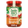 La sauce tomate Spaghetti Jardin BiO étic® est cuisinée avec des légumes, une pointe d'ail, du basilic et de l'huile d'olive. Tomates de plein champs Cuisiné en France dans le Lot et Garonne 1% for the planet BIO Sans arômes ajoutés