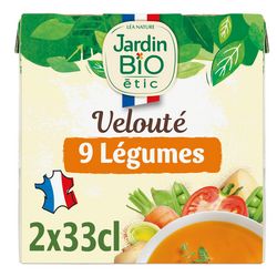 Le velouté de Jardin Bio étic est riche de 9 légumes pour un goût incomparable. Avec de bons légumes français, concocté à Arras dans le Nord de la France. Origine France Garantie Légumes France Cuisiné dans notre atelier à Arras 1% For The Planet BIO Sans conservateurs ni arômes ajoutés