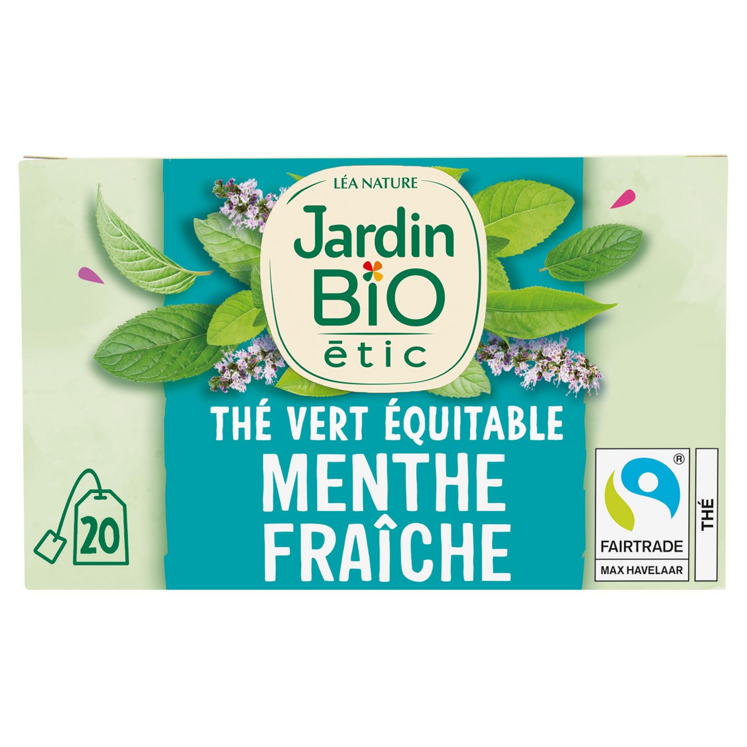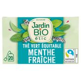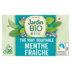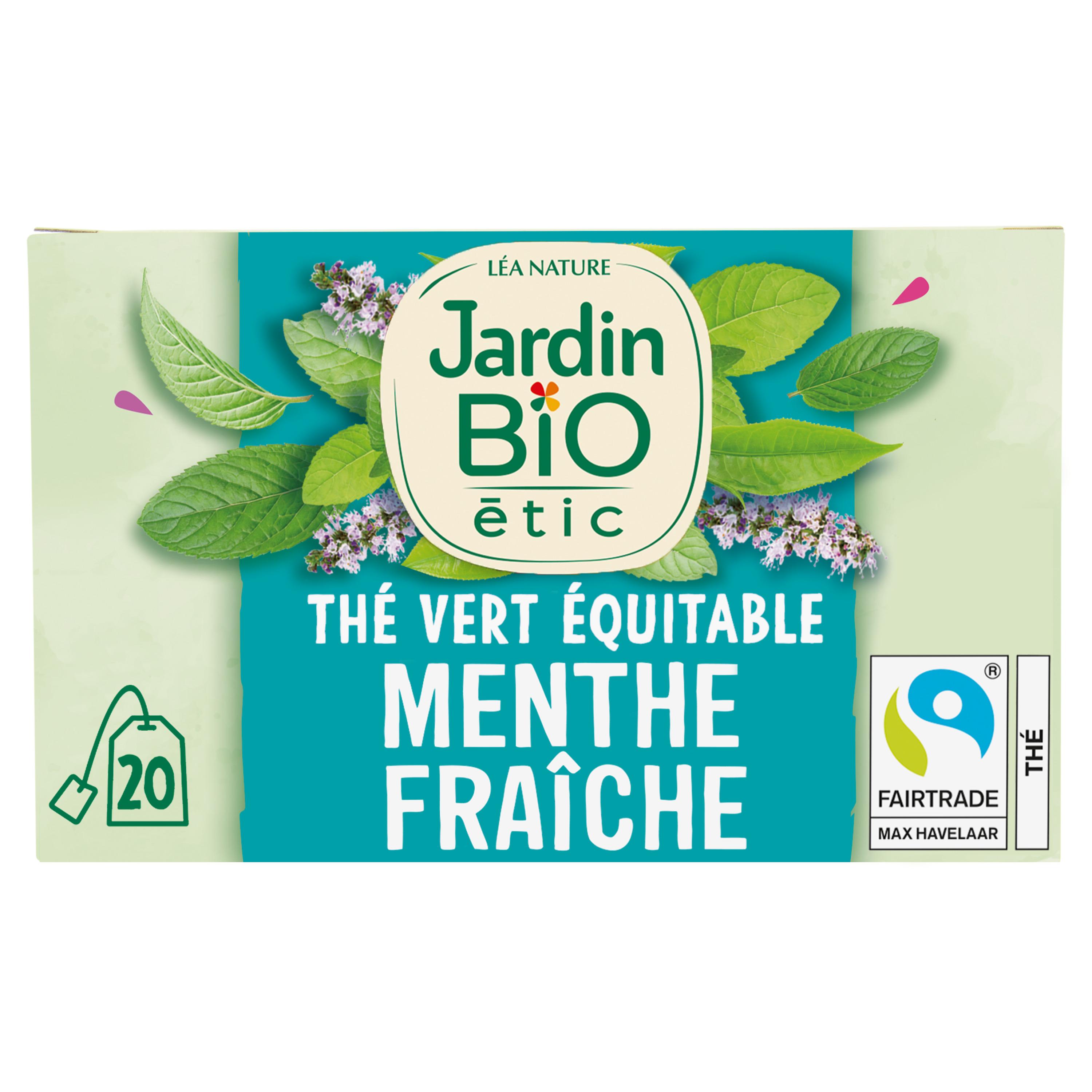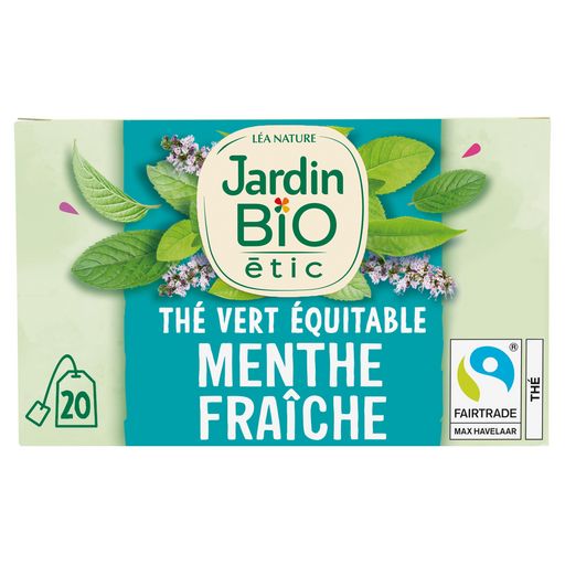 Retrouvez les thés bio gourmands Jardin BiO étic® imaginés à partir d'ingrédients naturels soigneusement sélectionnés. Une gamme plaisir, éthique et responsable ! Evadez-vous avec ce délicat mélange de thé vert et de feuilles de menthe françaises fraîches et parfumées. Thé vert à la menthe douce avec extrait de menthe bio Menthe origine France (selon disponibilité) Equitable (selon disponibilité) Fabriqué en France Infusettes compostables Emballage entièrement recyclable 1% pour la planète 100% Bio 20 sachets