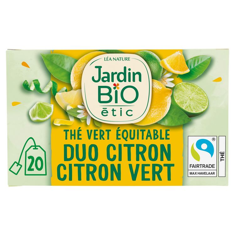 Retrouvez les thés bio gourmands Jardin BiO étic® imaginés à partir d'ingrédients naturels soigneusement sélectionnés. Une gamme plaisir, éthique et responsable ! Laissez-vous transporter par les notes gourmandes et acidulées de notre thé vert Duo Citron Citron Vert. Tout le thé de ce produit est issu du commerce équitable : cultivé par des producteurs certifiés et commercialisé selon les standards du label Fairtrade/Max Havelaar. www.maxhavelaarfrance.org Thé vert aux arômes naturels de citrons et citron vert Thé vert équitable certifié Max Havelaar (selon disponibilité) Fabriqué en France Infusettes et film compostables Etui carton 80% fibres recyclées 1% pour la planète Bio 20 sachets