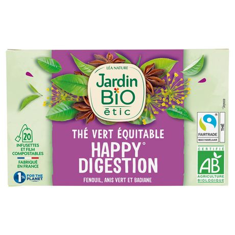 Retrouvez les thés verts bio bien-être Jardin BiO étic® imaginés à partir d'ingrédients naturels soigneusement sélectionnés. Une gamme fonctionnelle, éthique et responsable ! Profitez des vertus digestives de ce thé vert associé à diverses plantes comme le fenouil, l'anis vert et la badiane qui contribuent à faciliter la digestion en diminuant la sensation de ballonnements et favorisant le transit. Thé vert sans arômes Equitable Fabriqué en France 1% for the planet Infusettes compostables Emballage entièrement recyclable 100% Bio 20 sachets