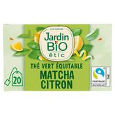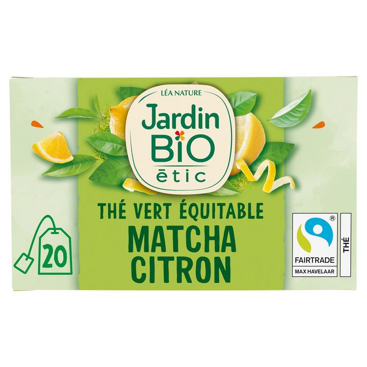 Retrouvez les thés bio gourmands Jardin Bio étic imaginés à partir d'ingrédients naturels soigneusement sélectionnés. Une gamme plaisir, éthique et responsable ! Evadez-vous avec ce mélange de thé vert, de citronnelle et de matcha subtilement aromatisé à l'extrait de citron bio. Tout le thé de ce produit est issu du commerce équitable : cultivé par des producteurs certifiés et commercialisé selon les standards du label Fair Trade/ Max Havelaar. www.maxhavelaarfrance.org Thé vert aux extraits de citron bio Equitable Fabriqué en France Infusettes et film compostables Etui carton 80% fibres recyclées 1% pour la planète BIO 20 sachets