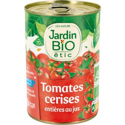 Les tomates cerises Jardin BiO étic sont pratiques pour accompagner vos plats de viande, vos papillotes de poisson et pour la préparation de vos pizzas maison. Tomates cerises de plein champs, entières au jus, sans sel ajouté.