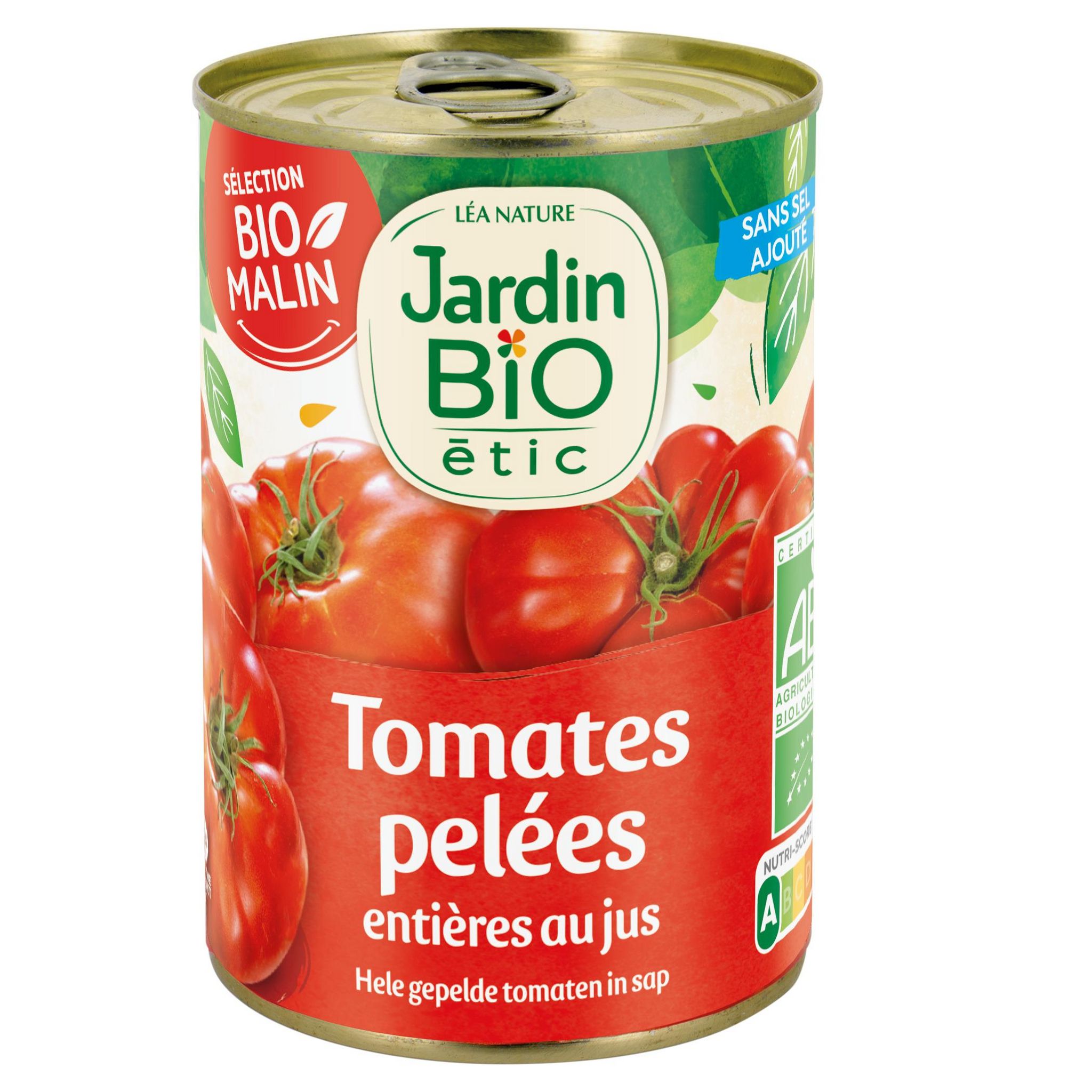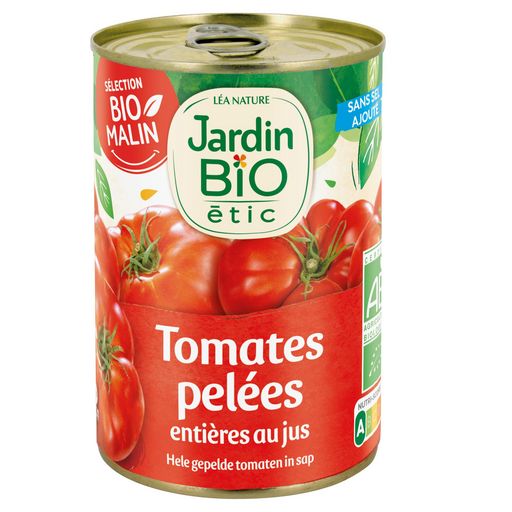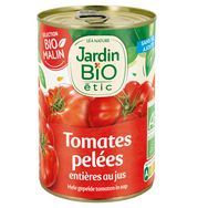 Les Tomates entières pelées Jardin BiO étic® sont élaborées à partir de tomates cultivées en plein champs, soigneusement sélectionnées pour leurs qualités gustatives et récoltées à leur juste maturité. Une solution pratique pour cuisiner bio facilement vos sauces, et plats cuisinés. Bio Malin, les produits bio du quotidien 1% for the planet BIO Sans sel ajouté
