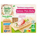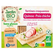 Découvrez l'alliance du quinoa et du pois chiche dans les Tartines croustillantes Jardin Bio étic® garanties sans gluten et sans lactose. Dégustez les remplacement du pain pour combler tous vos petits creux, ou au petit déjeuner