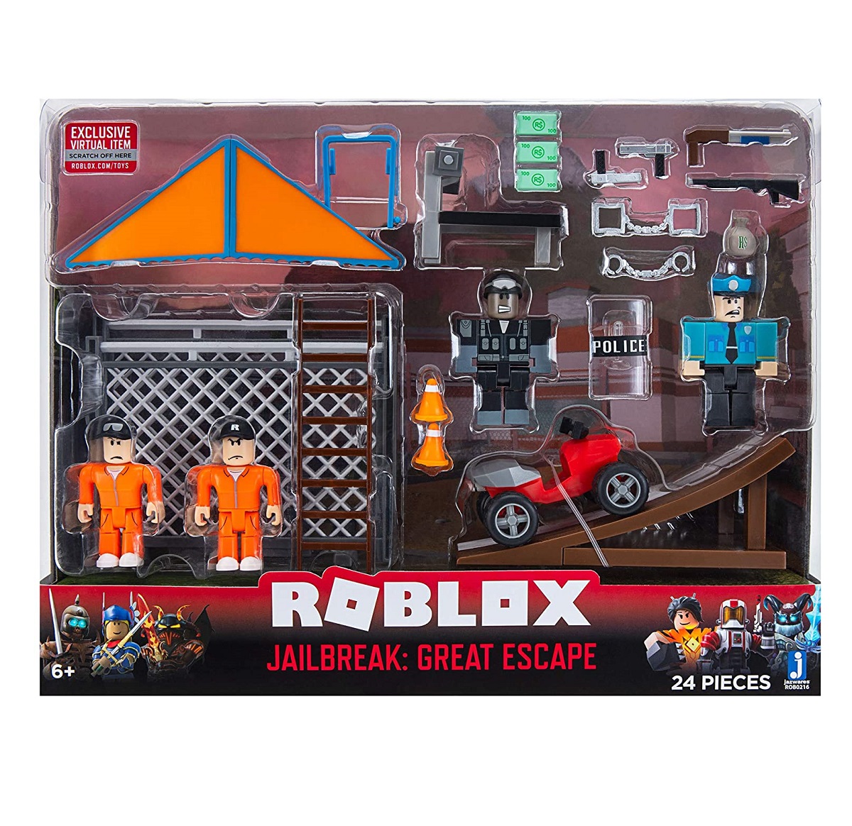 - Coffret de 24 pièces au total comprenant 4 figurines de 7.5 cm dont 2 prisonniers. Avec 1 deltaplane, 1 quad et de nombreux accessoires sur le thème de l'évasion de prison.